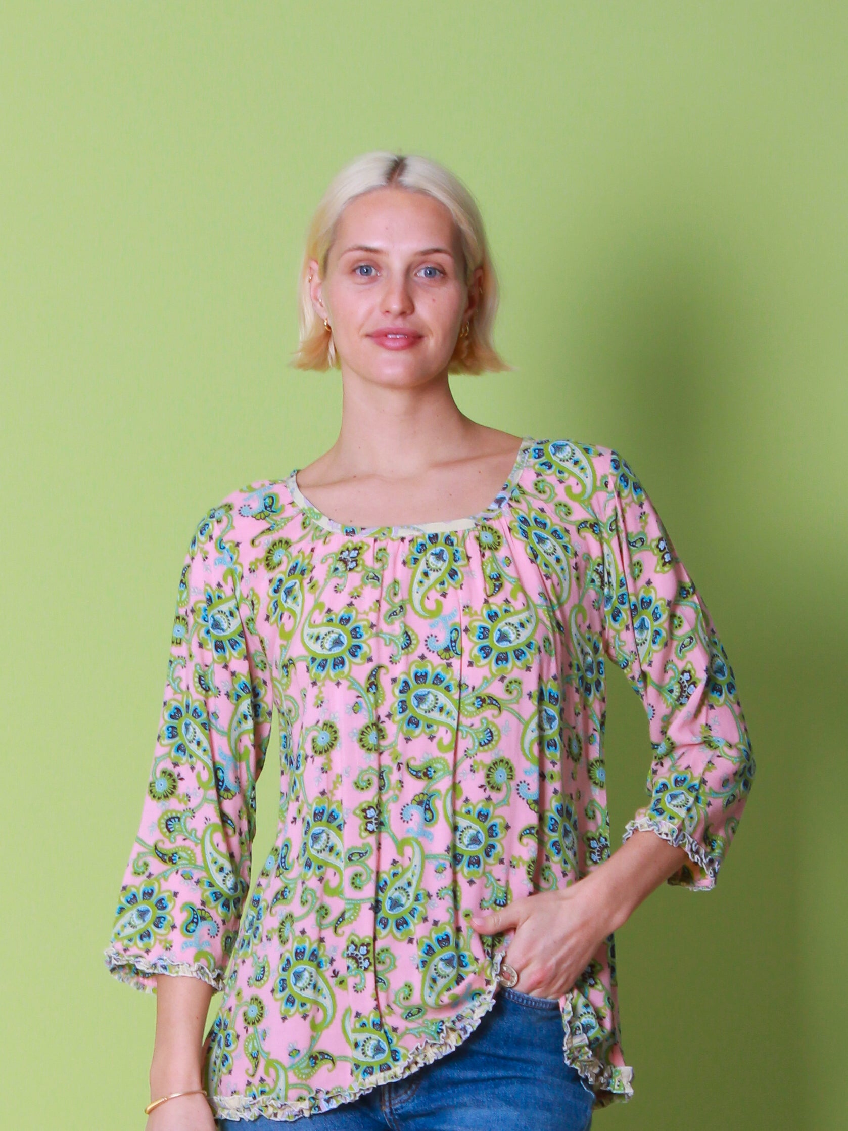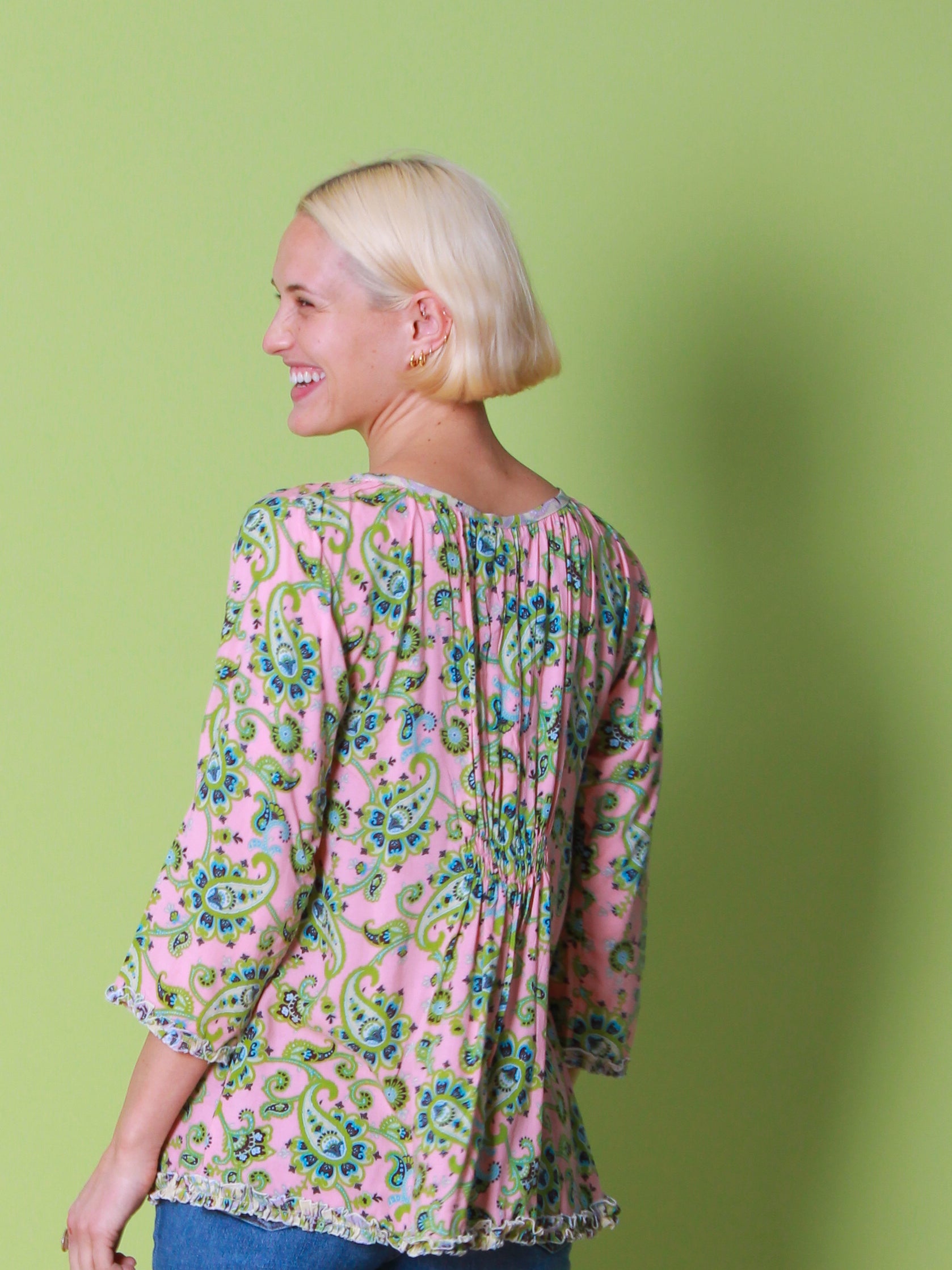 This pretty pink paisley top features a sweet mini contrast frill on the sleeves and the hem. With a subtle elasticated gather at the back, this top is both flattering and very versatile. We recommend buying your normal size.